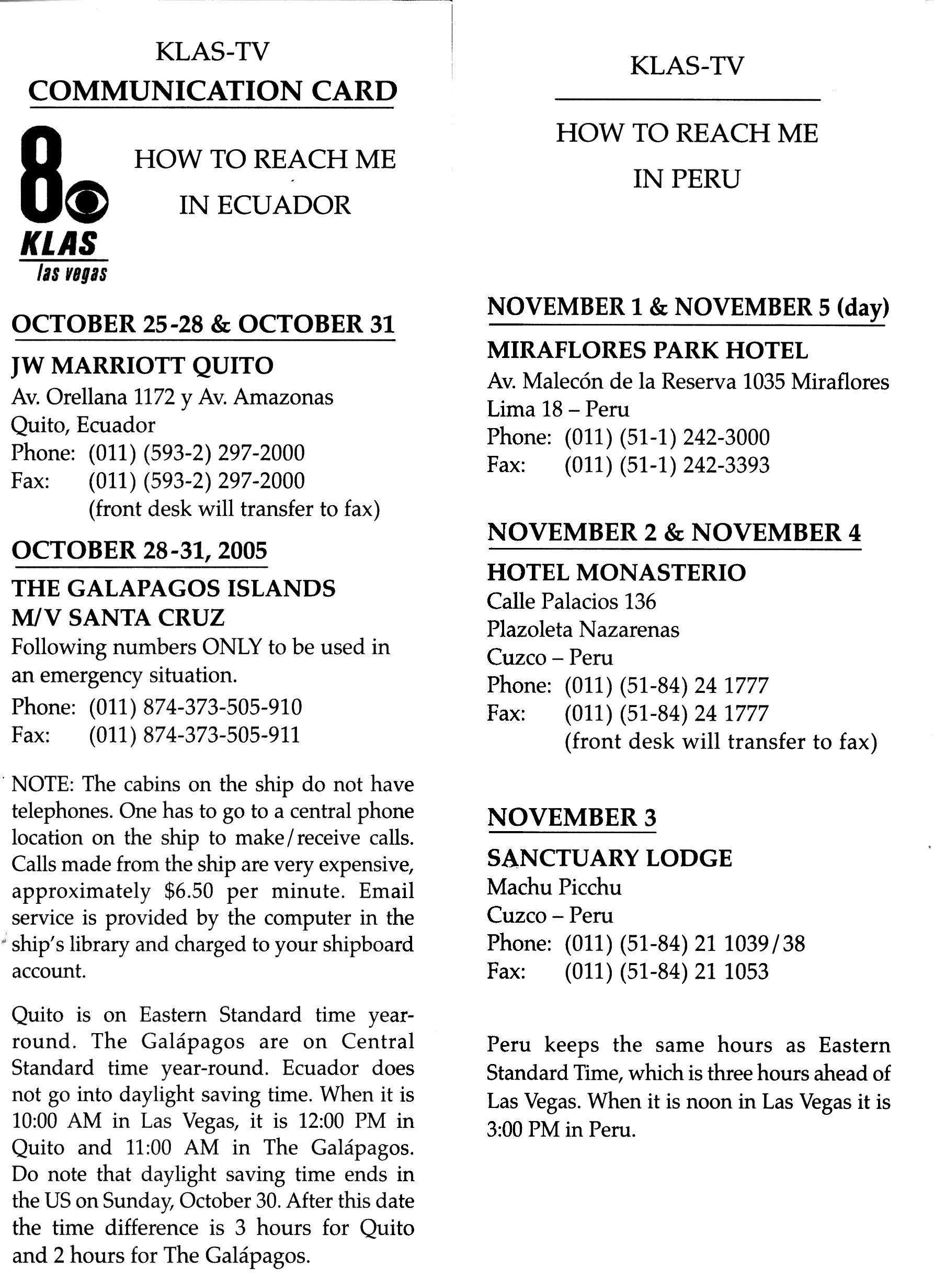 Here is our contact information for the trip to Ecuador/Peru.